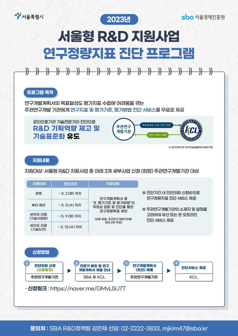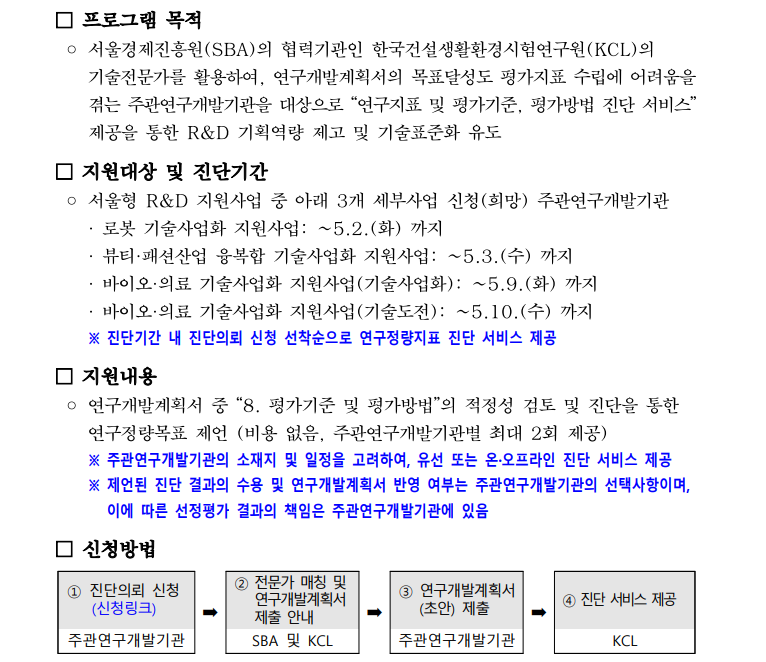 첨부파일 서울형 R&D 지원사업 (로봇, 뷰티·패션, 바이오·의료) 연구정량지표 진단 프로그램 안내.pdf [ 196.00Kb ]