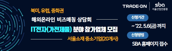 □ 사업개요 ○ 사 업 명 : trade-ON 해외온라인 비즈매칭 상담회(IT·전자-가전제품 분야) ○ 추진목적 : 수출기업-바이어 간 정기적 B2B 상담지원으로 수출거래 활성화 ○ 개최일정 : ‘22년 6월 말 예정 ※ 개최일정 확정 시 개별안내 예정 ○ 개최장소 : trade-ON 화상상담장 - 서울시 강서구 공항대로61길 29 SBA국제유통센터 A동 2층 ○ 주요내용 : 기업-바이어 간 1:1 수출상담회 진행
