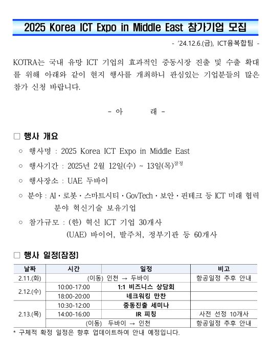 1. 행사 개요 및 진행 내용 가. 행사명: 2025 Korea ICT Expo in Middle East 나. 행사기간: 2025년 2월 12일(수)~13일(목) * 잠정 다. 행사장소: UAE 두바이 라. 분야: AI, 로봇, 스마트시티, GovTech, 보안, 핀테크 등 미래 협력 분야 혁신기술 보유 기업 마. 참가규모: (한) 혁신 ICT 기업 30개사 (UAE) 바이어, 발주처, 정부기관 등 60개사
