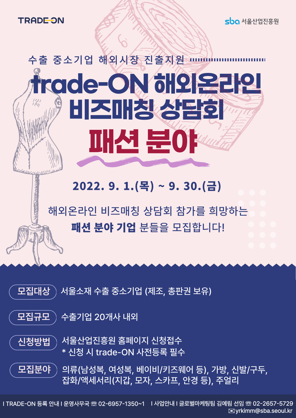 안녕하세요, 서울산업진흥원(SBA) 글로벌마케팅팀입니다. 서울산업진흥원에서는 서울시 중소기업의 해외시장 진출지원을 위해 다가오는 11월 '패션 분야 해외온라인 비즈매칭 상담회'를 개최합니다. 해외 바이어와의 매칭을 희망하시는 패션기업 분들께서는 포스터와 첨부 공고문을 참고하여 신청해주시기 바랍니다.
