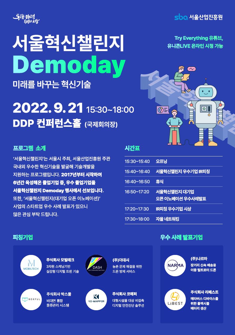 서울시 글로벌 스타트업 대축제 Try Everything과 연계하여, '서울혁신챌린지 Demoday - 미래를 바꾸는 혁신기술'을 아래와 같이 개최합니다. 관심 있으신 분들의 많은 참여 바랍니다.